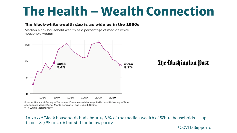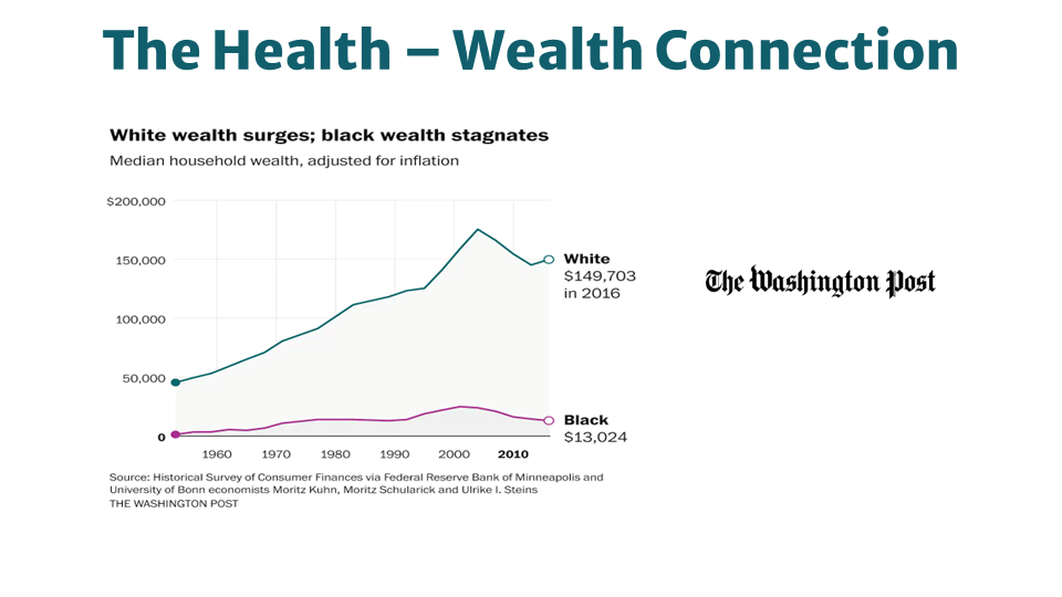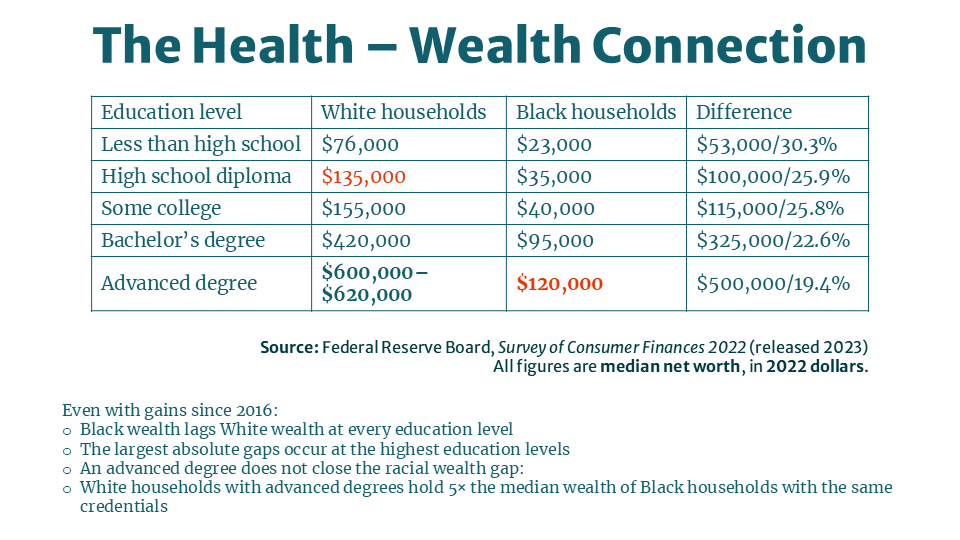 Why It Matters: In America, health outcomes mirror economic outcomes. The median white family holds eight times the wealth of the median Black family — a gap that has barely moved in 50 years. This isn't a savings problem; it's a policy problem rooted in redlining, exclusions from the social safety net — as seen in the example of the GI Bill — and ongoing discrimination in lending and homeownership. We believe that with inclusive policies, targeted investments, and the ending of predatory practices, people of color will experience parity in income and wealth with their white peers.