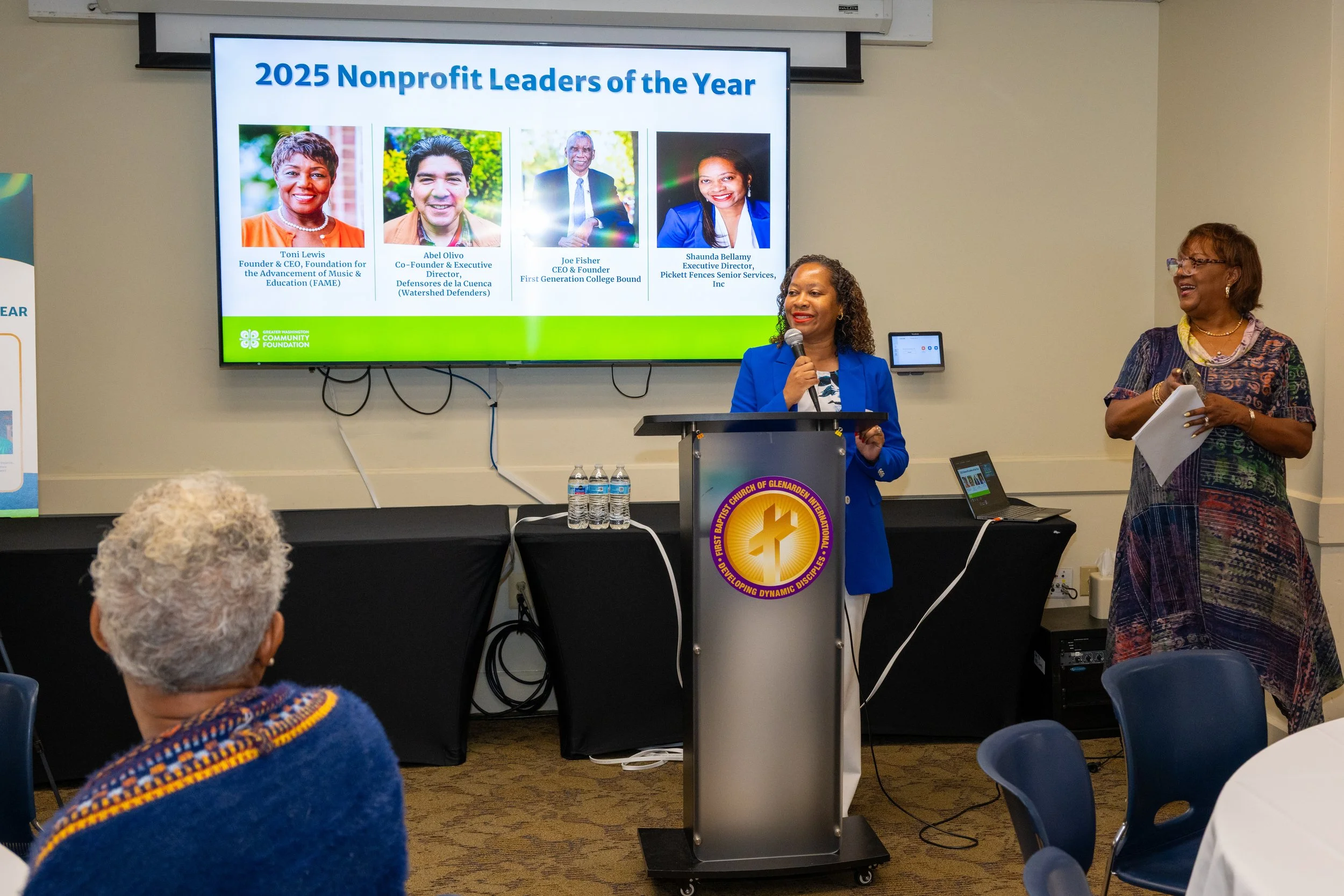 After Congressman Ivey’s remarks, Darcelle Wilson, The Community Foundation’s Executive Director for Prince George’s County presented the 2025 Nonprofit Leaders of the Year – Shaunda Ballamy, Executive Director of Pickett Fences Senior Services; Joe Fisher, CEO & Founder of First Generation College Bound; Toni Lewis, Founder & CEO of Foundation for the Advancement of Music & Education (FAME); and Abel Olivo, Co-Founder and Executive Director of Defensores de la Cuenca.